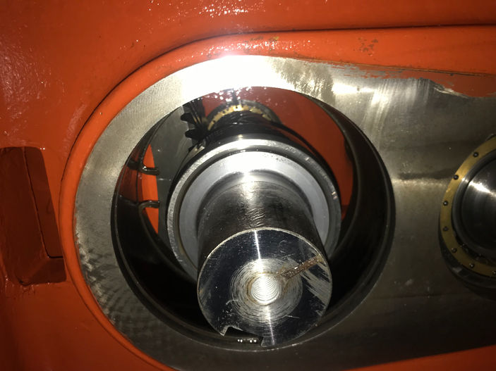 When new gears arrived, the gearbox was opened to remove worn gears and find root cause of the problem. During investigation, it was found that the free shaft had been previously repaired, and repair on the keyway poorly done. The previous repair failed with a large piece of the keyway fractured which caused severe pitting on gear mating surface of the shaft.